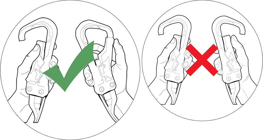 1、按下登山扣門打開解鎖的掛鉤,第二個(gè)登山扣保持鎖定狀態(tài)。